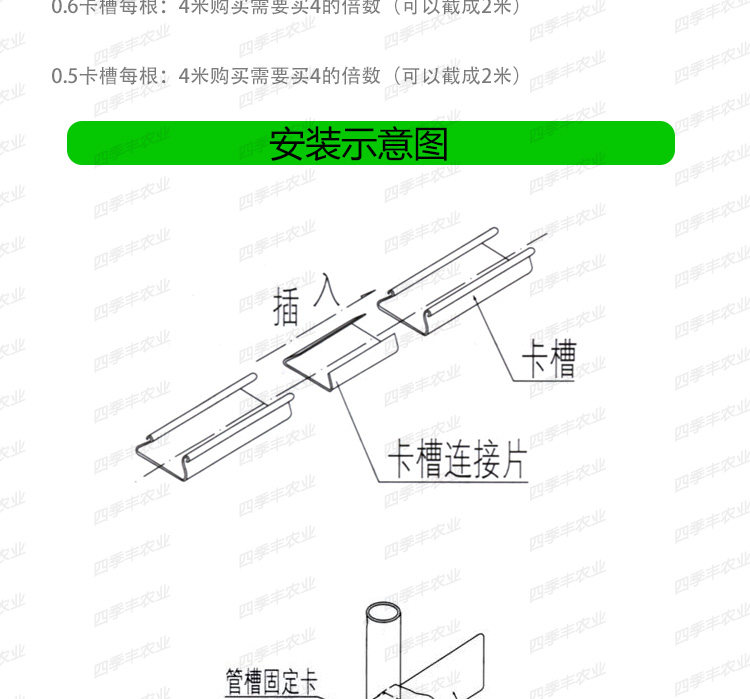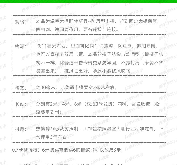1。規(guī)格:本產(chǎn)品為防風(fēng)型熱鍍鋅卡槽,起到固定薄膜,防蟲網(wǎng)和遮陽網(wǎng)等作用!規(guī)格有         0.5mm,0.6mm,0.7mm,0.8mm(此處標(biāo)示的厚度為卡槽的壁厚)!槽深為11mm左右,   槽寬為30mm左右!