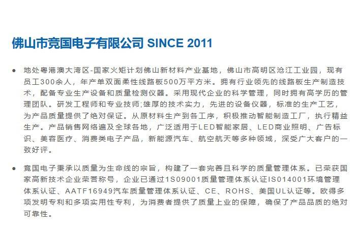 公司采用現(xiàn)代企業(yè)的科學(xué)管理,同時(shí)擁有高學(xué)歷的管理團(tuán)隊(duì),研發(fā)工程師和專(zhuān)業(yè)技師:排厚的技術(shù)實(shí)力,先進(jìn)的設(shè)備儀器,標(biāo)準(zhǔn)的生產(chǎn)工藝,為產(chǎn)品質(zhì)量提供了絕對(duì)保證,從原材料生產(chǎn)到各工序,積極推動(dòng)智能制造工廠,執(zhí)行精益生產(chǎn)。產(chǎn)品銷(xiāo)售網(wǎng)絡(luò)遍及全球各地,廣泛適用于LED智能家居、LED商業(yè)照明、廣告標(biāo)識(shí)、美容醫(yī)療、消費(fèi)類(lèi)電子產(chǎn)品,新能源汽車(chē)、航空航天等多種領(lǐng)域,深受廣大客戶(hù)的一致好評(píng)。 競(jìng)國(guó)電子秉承以質(zhì)量為生命線(xiàn)的宗旨,構(gòu)建了一套完善且科學(xué)的質(zhì)量管理體系。已榮獲國(guó)家高新技術(shù)企業(yè)榮譽(yù)稱(chēng)號(hào),企業(yè)已通過(guò)IS09001質(zhì)量管理體系認(rèn)證、IS014001環(huán)境管理體系認(rèn)證、IATF16949汽車(chē)質(zhì)量管理體系認(rèn)證、CE、ROHS、美國(guó)UL認(rèn)證等。為消費(fèi)者提供了質(zhì)量上乘的保障,確保了產(chǎn)品品質(zhì)的絕對(duì)可靠性。
